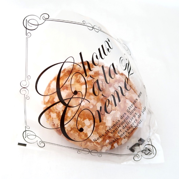 カリカリ食感のザラメ糖とバタークッキーをのせて焼いたシュー皮に、軽いクリームを詰めました。